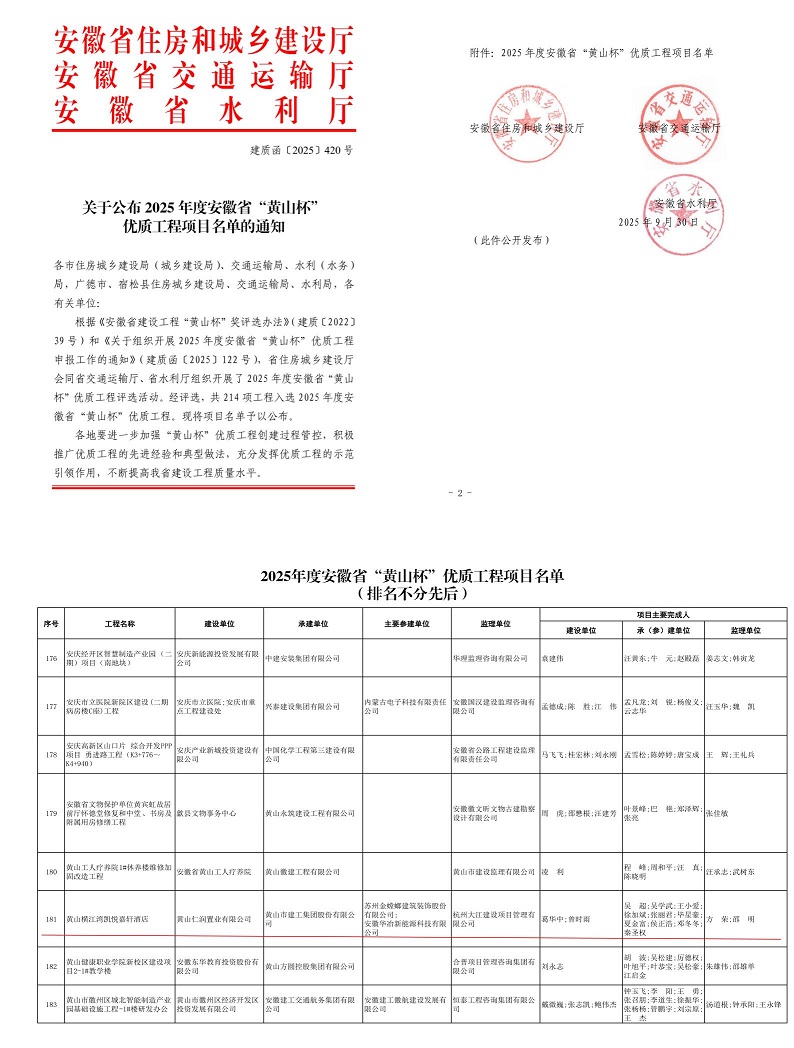 近日,安徽省住房和城鄉(xiāng)建設(shè)廳、安徽省交通運輸廳、安徽省水利廳聯(lián)合公布了2025年度省“黃山杯”優(yōu)質(zhì)工程項目名單,黃山市建工集團承建的黃山橫江灣凱悅嘉軒酒店項目成功入選,榮膺安徽省建設(shè)工程質(zhì)量最高榮譽——“黃山杯”獎。